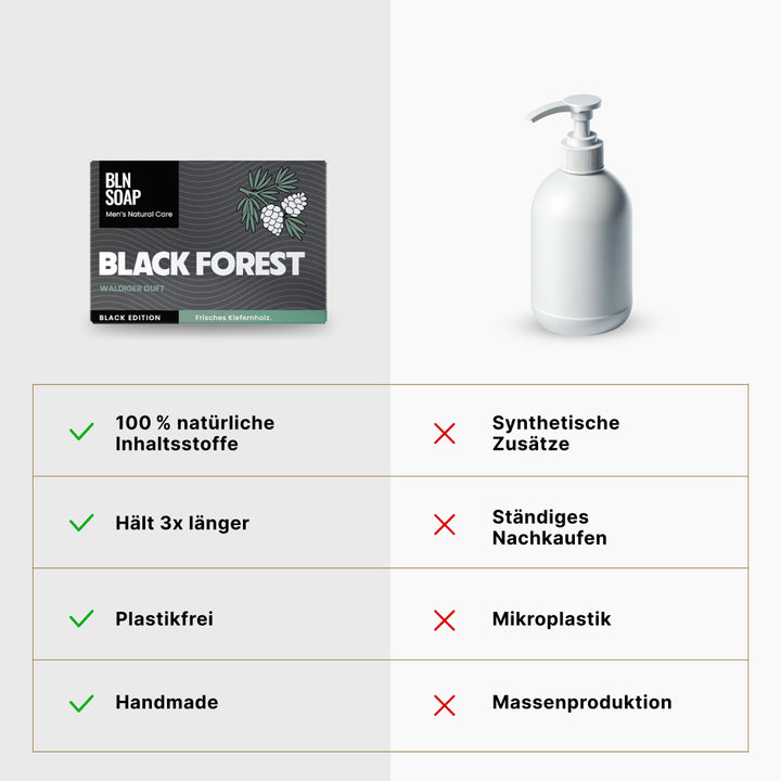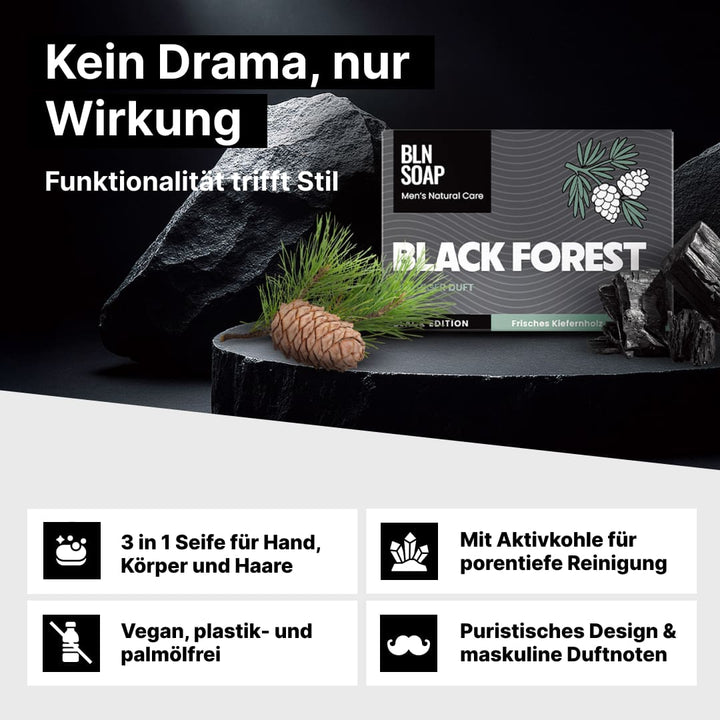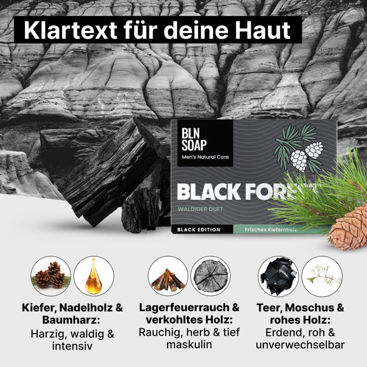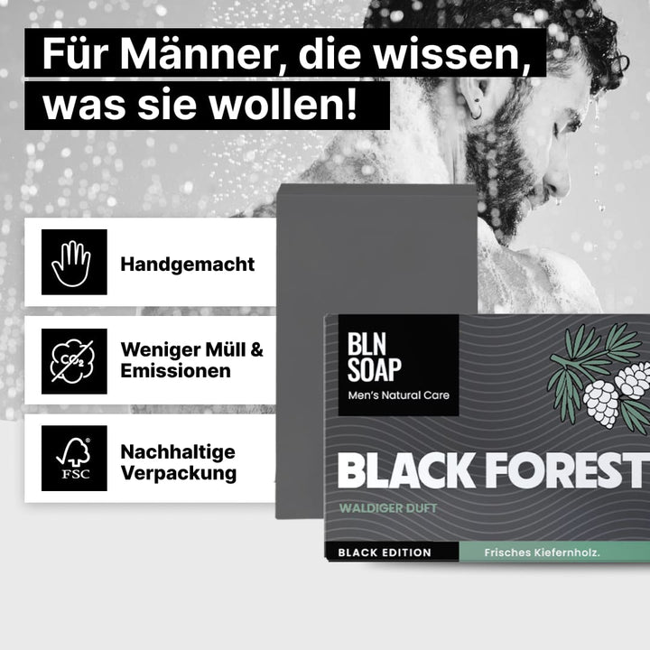 Wenn du dich nach Natur sehnst und auf nachhaltige Männerpflege setzt, ist Black Forest genau die richtige Wahl. Eine feste Seife, die maskuline Frische, Natürlichkeit und Pflege in einem Stück vereint.