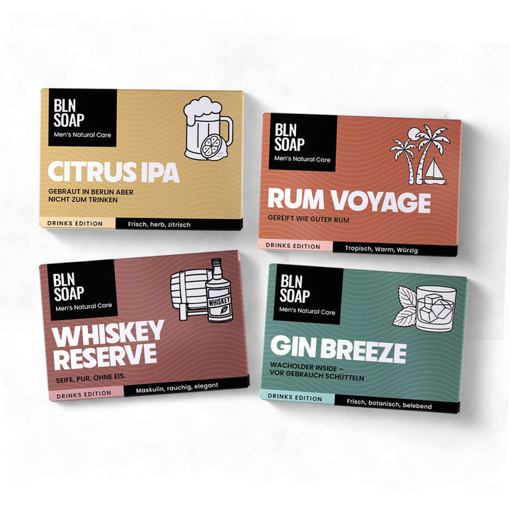 Das Drinks Set ist ein Erlebnis für alle Sinne: Vier charakterstarke Düfte inspiriert von den beliebtesten Drinks. Ob der frische Kick von Gin Breeze, die tropische Wärme von Rum Voyage, die elegante Note von Whiskey Reserve oder die spritzige Energie von Citrus IPA – hier bekommst du die volle Vielfalt. Alle Seifen sind feste Seifen für Männer, handgefertigt in Holland, plastikfrei verpackt und voller natürlicher Inhaltsstoffe. Ein Set, das Stil, Spaß und nachhaltige Pflege perfekt vereint.