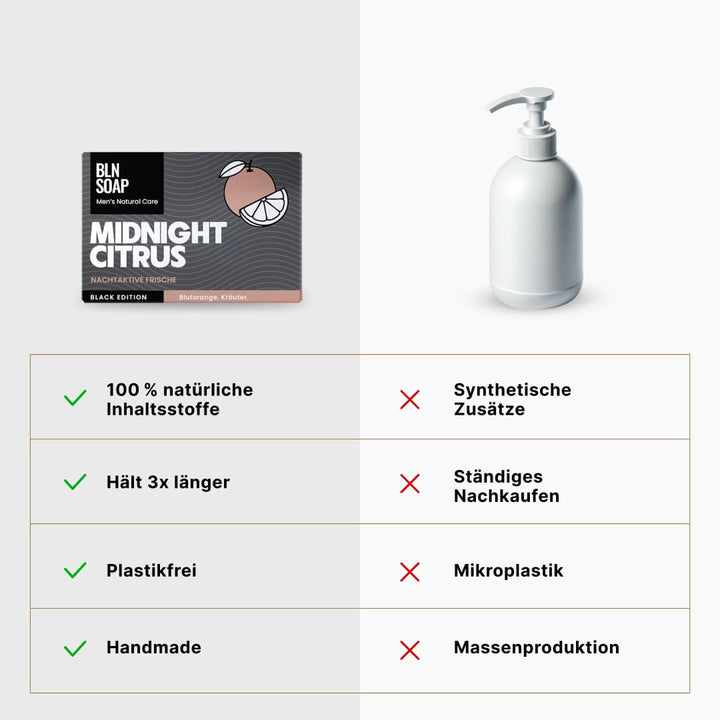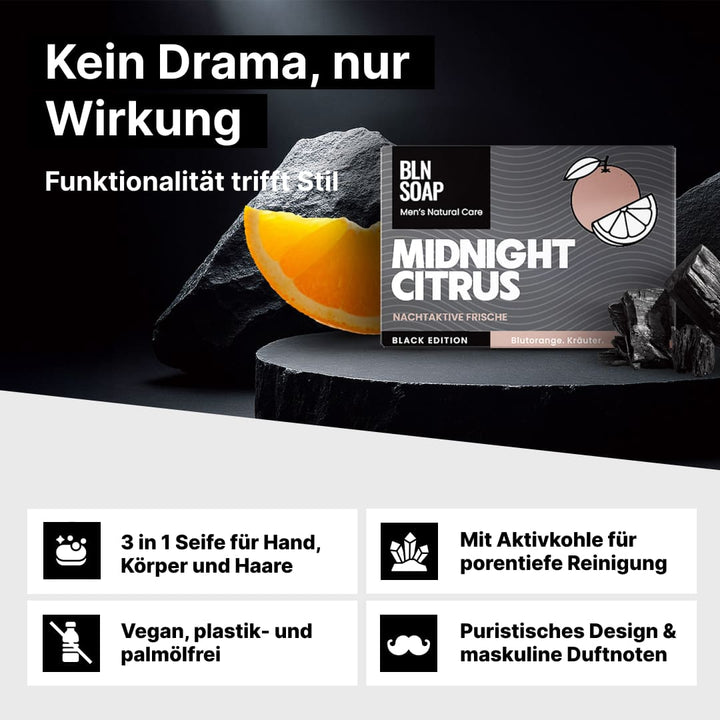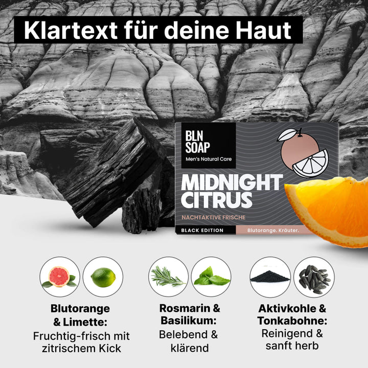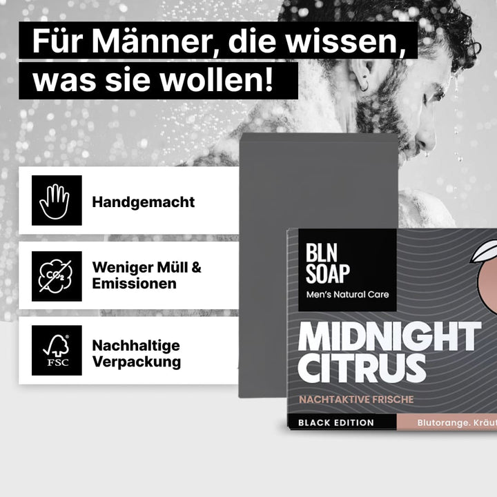 Diese Seife ist perfekt, wenn du frische Düfte magst, die dennoch geheimnisvoll wirken. Midnight Citrus ist nachhaltig, maskulin und ideal für Männer, die Wert auf Individualität und Qualität legen.
